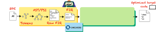 Last, a checkers stage is run, which takes FIR and reports different diagnostics for warnings and errors. If there are errors, compilation stops since there is no need to send broken code to the backend. If there are no errors, the resovled FIR is then transformed to backend IR in for the backend.