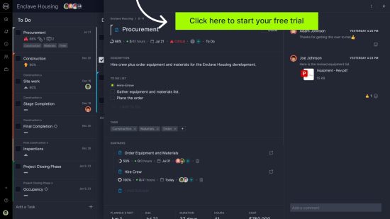 Vendor management is all about staying connected with your team and evaluating the performance of your selected vendor. Team communication is easy with ProjectManager’s suite of collaboration tools. Upload files as necessary to help you select the right vendor. Collaborate at the task level on contract terms and input your feedback as comments to stay connected with your team in real time.