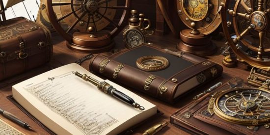 magnifying glass, steampunk, desk, ((ancient open expedition notebook with ink notes)), inkwell, boat, helm, (((sailing wheel))), ((ink notes))