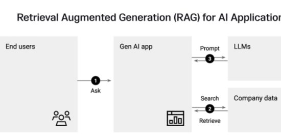 The diagram represents the Retrieval-Augmented Generation (RAG) process for AI applications. The flow starts with end users posing a query or “Ask” as represented by step 1. This inquiry is directed to a “Gen AI app,” which then proceeds to “Search” and “Retrieve” relevant information from a “Company data” repository, as denoted by step 2. Once the data is fetched, it is used as a “Prompt” to instruct the “LLMs” (which likely stands for some form of language models) in step 3. The LLMs then generate an appropriate response based on the prompt and the initial query, synthesizing the retrieved data to provide a coherent and informed answer back to the end user. This RAG process combines the capabilities of information retrieval with the advanced generative capabilities of language models to offer detailed and contextually accurate answers.