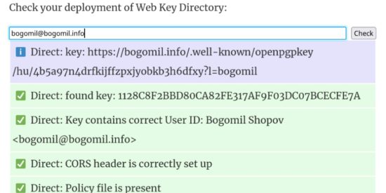 This morning, I set up my Web Key Directory (WKD) so anyone with an email client that supports this can auto-discover my public OpenPGP key without needing to look at any key server or rely on information from my website.