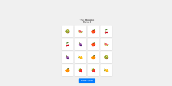 The Memory Game is a classic card-matching game that helps improve memory and concentration skills. The objective of the game is to match pairs of cards with the same image. The game begins with all cards faced down, and players take turns flipping over two cards at a time, trying to find matching pairs.