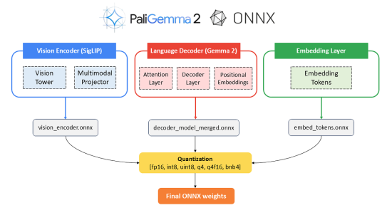 Similarly, the conversion process for the language decoder is: Gemma 2 [Attention Layer, Decoder Layers, Position Embeddings] → decoder_model_merged.onnx.