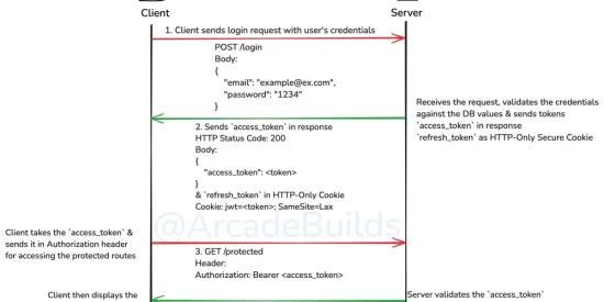 - The server verifies the credentials and, if valid, issues an access token and a refresh token.