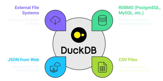 Contrairement à de nombreuses bases de données qui nécessitent l’importation de données avant l’interrogation, le moteur de requête de DuckDB est conçu pour fonctionner directement sur plusieurs formats de fichiers et bases de données externes . Voici ce qui le distingue :