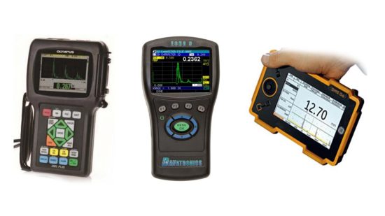 Thickness gages have evolved over 40 years from analog to advanced digital systems. Ultrasonic gages use a transducer to convert electrical energy into vibrations, measuring the time taken for these vibrations to calculate material thickness.