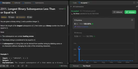 Today, we dive into a clever bit manipulation puzzle — LeetCode 2311: Longest Binary Subsequence Less Than or Equal to K. It’s all about squeezing the longest subsequence out of a binary string that forms a number ≤ k. Let’s decode this one together! 🧠