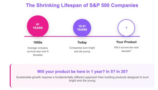 The average S&P 500 company now survives just 15-21 years, down from 61 years in the 1950s. We build products designed to burn bright and die young, yet sustainable growth requires a fundamentally different approach. Product managers should ask: Will my product be here in a year? In five? In twenty? What can I do Read more »