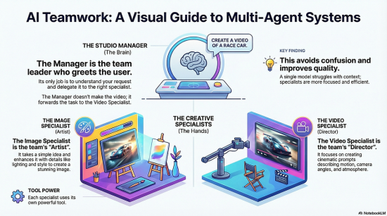 For the visual learner, this is a game-changer. Imagine a system where you act as the client, and an AI “Studio Manager” delegates your requests to specialized “Artists” and “Directors” to produce high-fidelity images and cinematic videos.
